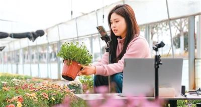 “爱生活园艺”主播在大棚里进行现场直播。 王 强摄