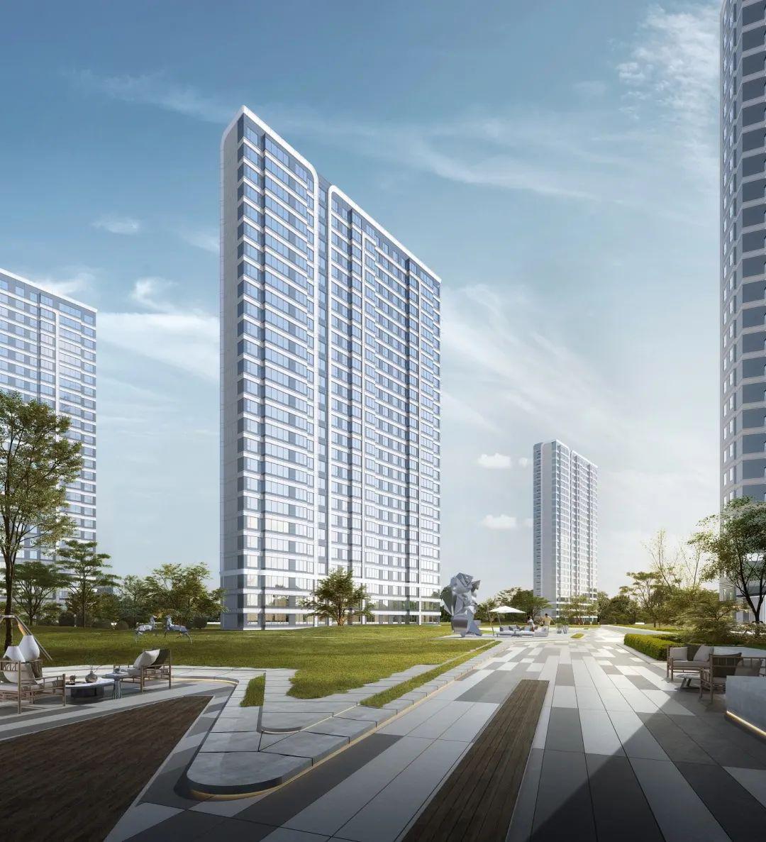 项目采用现代简约风格,外立面选用米色及灰色石材和真石漆,配以精致铝板+大面积Low-e中空玻璃,让社区更显高质大气、历久弥新。