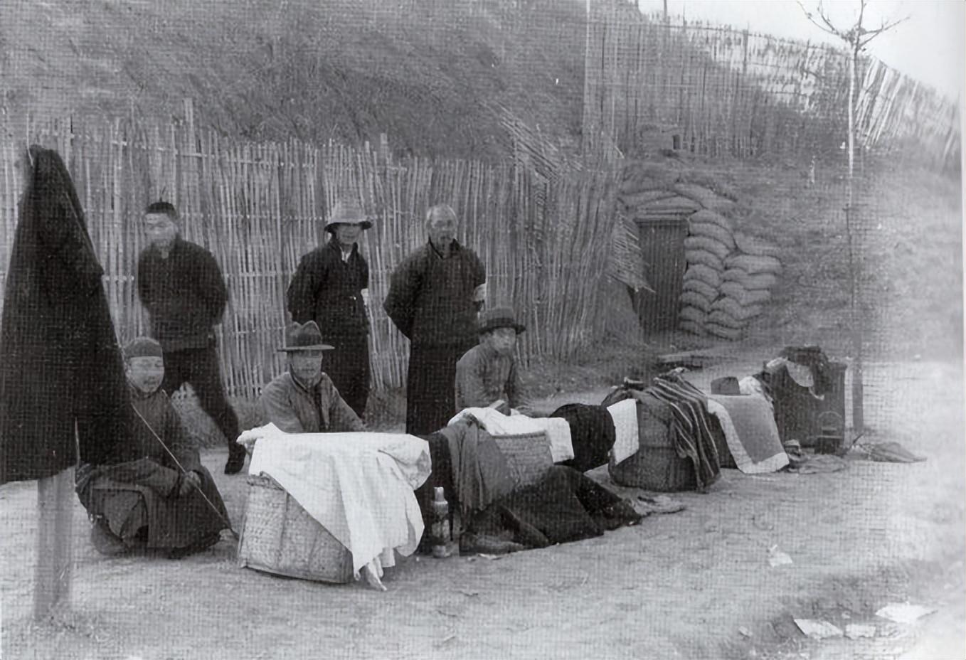 照片中是1937年12月的南京,土路边搭着简易遮阳布,地上铺一块白布,上面摆着几件旧棉袄、破被子、旧鞋等。三四个中国男子蹲坐在摊位后面,神情木讷、疲惫。后面竹篱笆墙和沙袋堆成的简易工事,明显是战时环境,但是没有顾客,摊主低头或发呆,气氛死气沉沉。