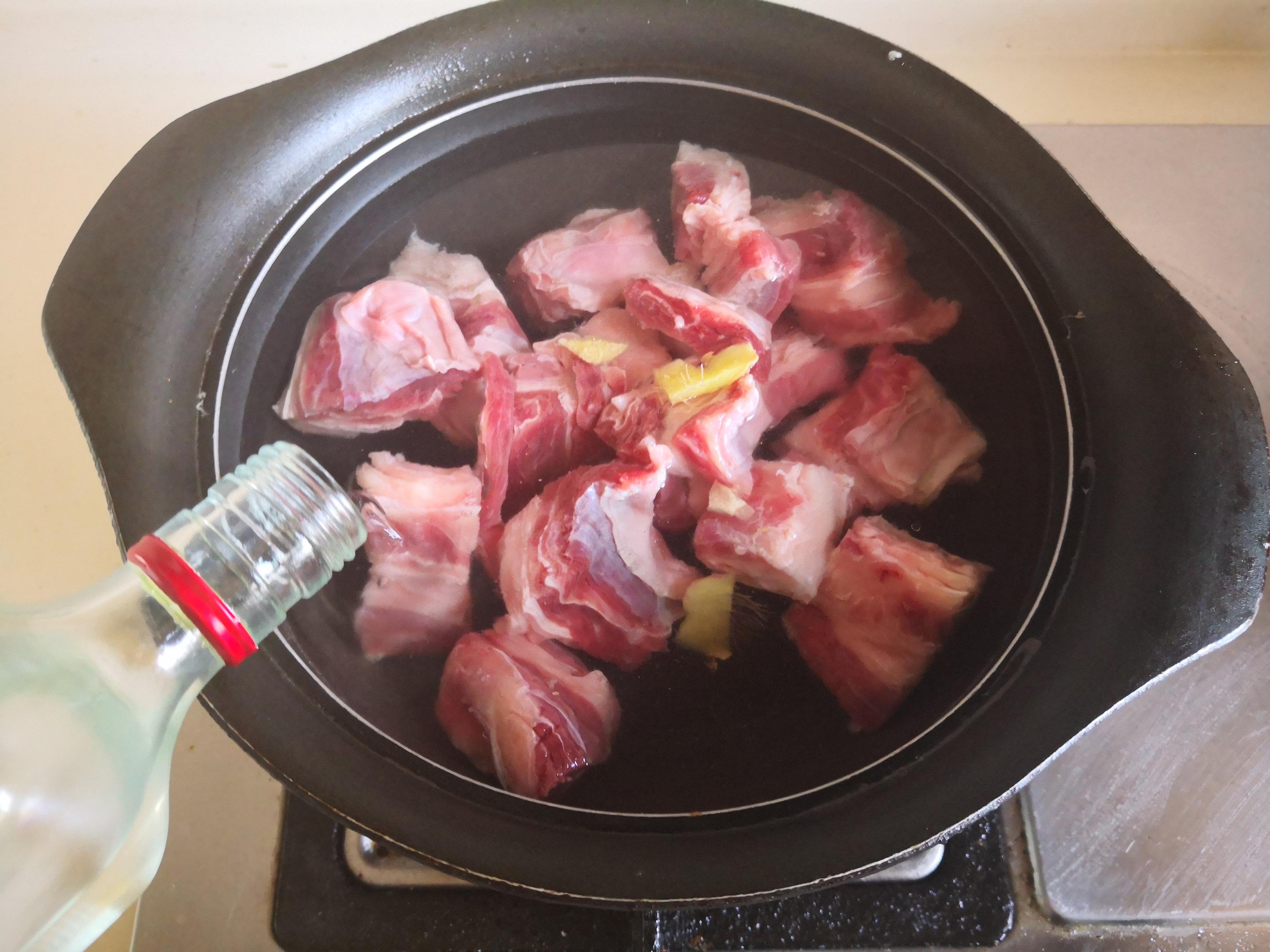 制作过程: 1. 烧锅水,将牛腩块放进冷水锅中去焯煮,加入少许姜片和高度白酒去腥,焯出浮沫后捞出备用;