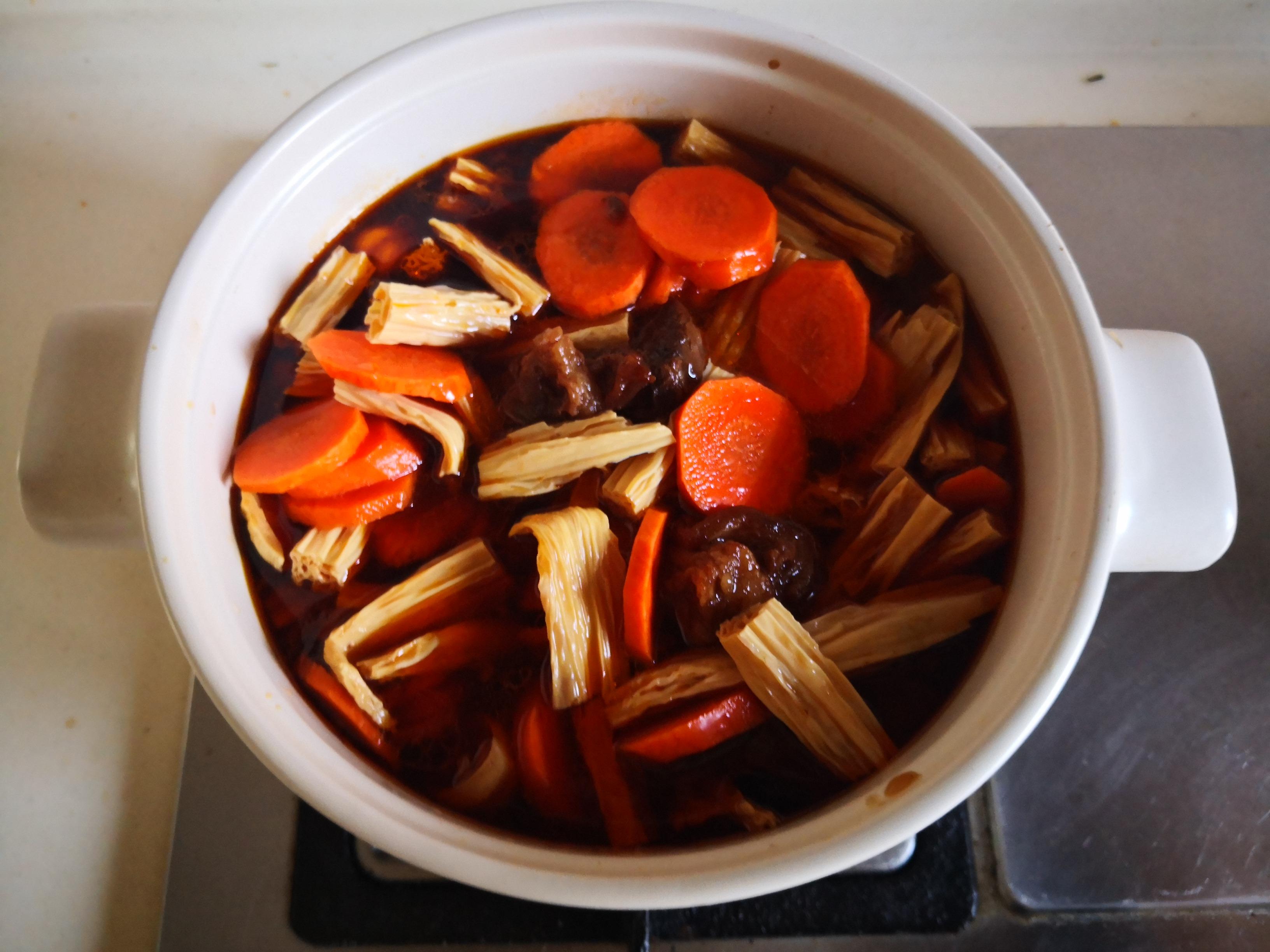 4. 加入准备好的胡萝卜片和泡软的腐竹进锅炖煮五分钟;