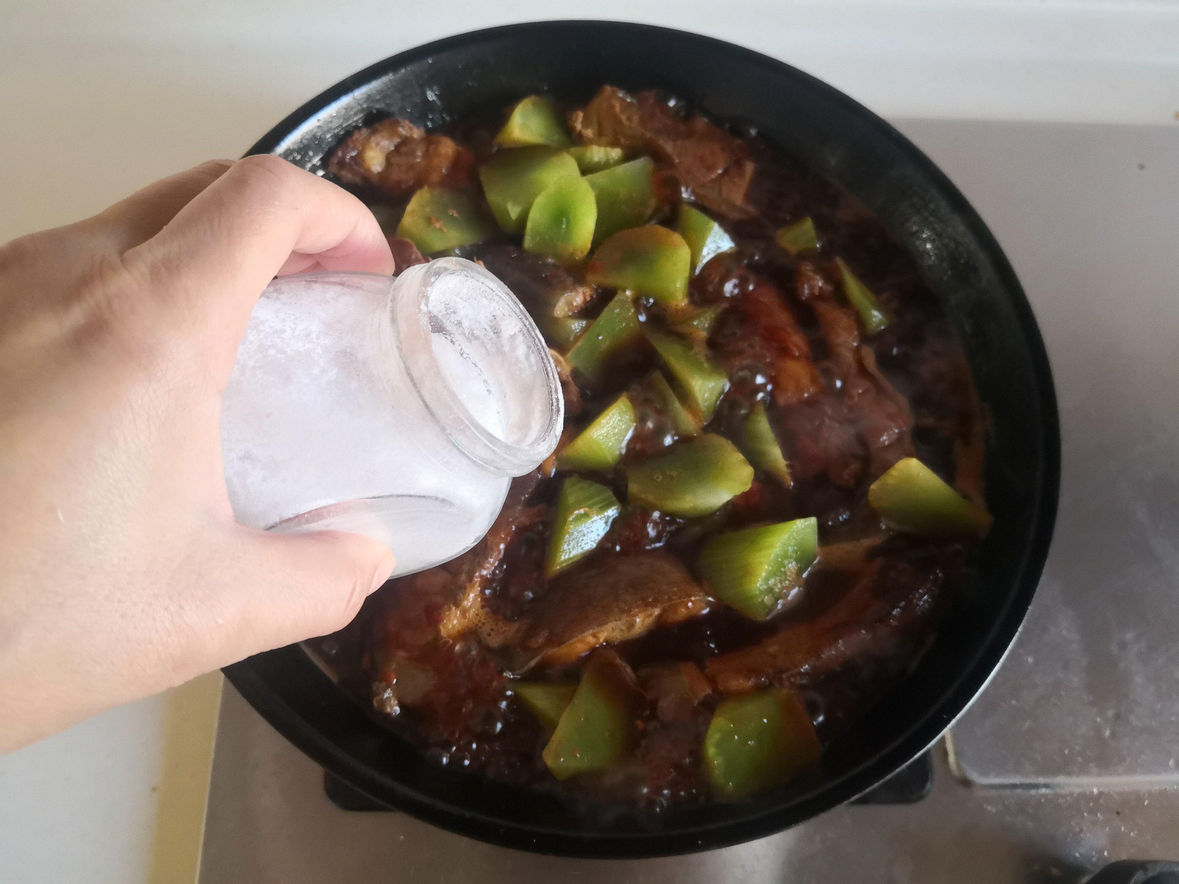 5. 炖煮熟后加入少许盐和胡椒粉调味,大火收汁,最后放入少许青蒜进锅变色即可。