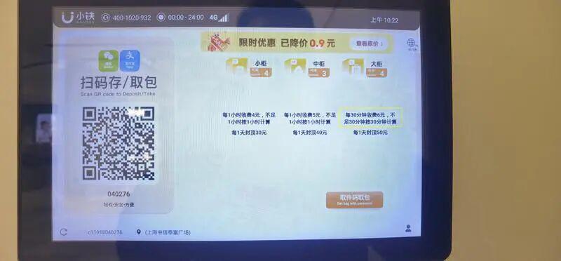 有没有以半小时为单位来计费的?有。海岸君调查发现,中信泰富广场的自助寄存柜(非地铁站点),在小柜与中柜按小时收费的同时,大柜就是以30分钟为计费的时间单位,只不过,那里的寄存价柜要贵些,为“每30分钟收费6元”,“每1天封顶50元”。该自助寄存柜上显示的“抬头”也出现在地铁自助寄存柜上,均为“小铁”。