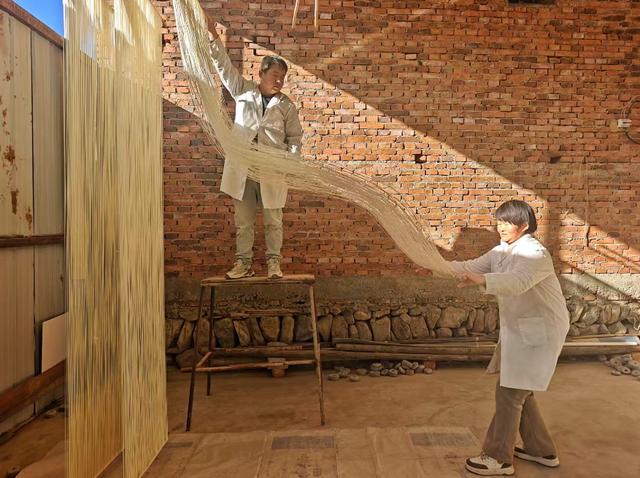 郭军盈熟练地登上1米高的梯凳,张益把缠绕在两根木筷上的细面条递上来,他接过稳稳地插在院中近3米高的晾面架上,交替用木筷熟练地分面。张益则猫腰拉起另一端的木筷,有节奏地扯面。两人通过眼神和动作交流,面条在他们手中犹如丝带般舞动。