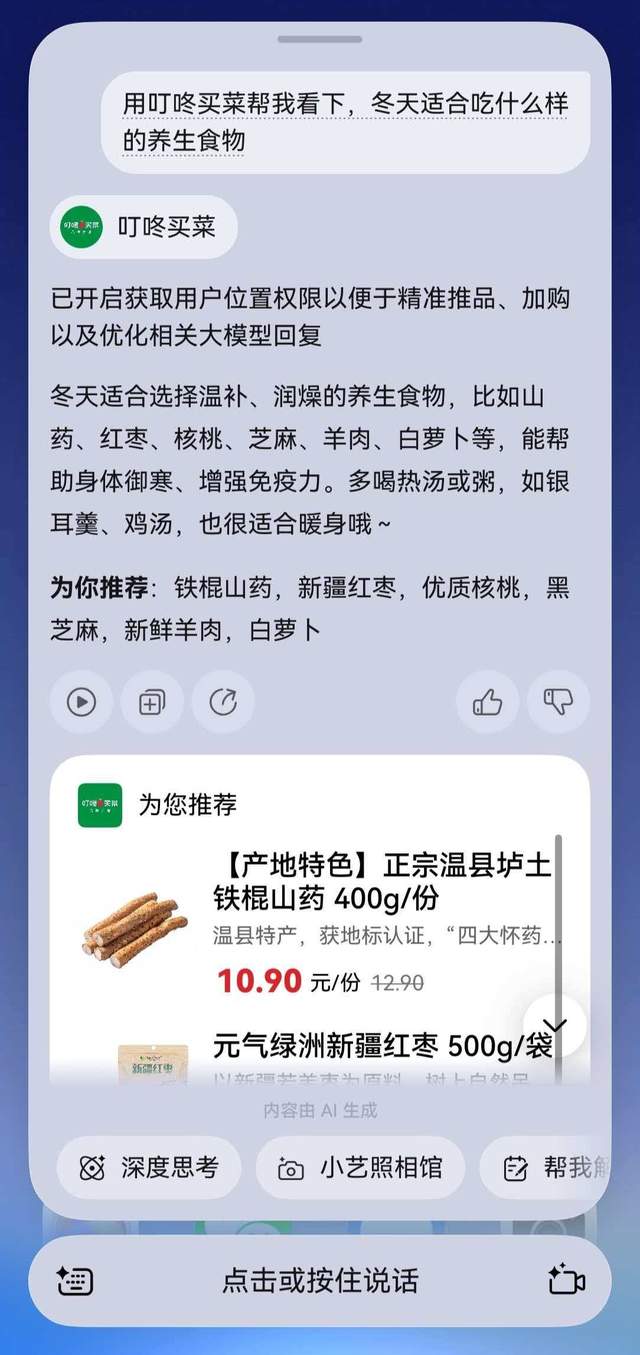 比如每到饭点最头疼的“吃什么”问题,现在你可以直接对小艺说:“用叮咚买菜帮我看下,冬天适合吃什么样的养生食物”。小艺会立刻协同叮咚买菜智能体,不仅推荐山药、红枣、核桃、芝麻、羊肉等食材,还能直接列出食材购买链接,点击即可一键加购,从选菜到下单,全程省心又高效。除此之外,在生活中,京东购物助手、海底捞、大麦-大麦麦宝、张大妈、支付宝-AQ蚂蚁健康管家、讯飞晓医等智能体也已上线,全方位覆盖生活所需。