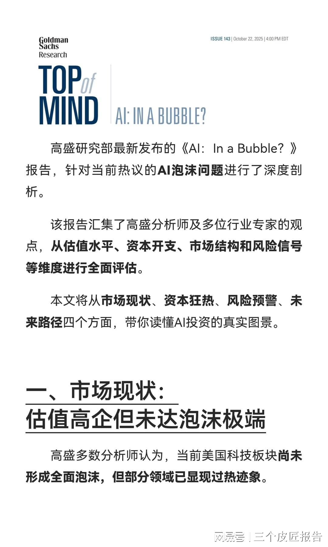 该报告汇集了高盛分析师及多位行业专家的观点,从估值水平、资本开支、市场结构和风险信号等维度进行全面评估。