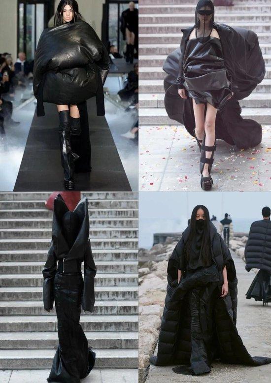 Rick Owens 的作品总是故意暴露缝线、拼接、甚至结构逻辑,仿佛在告诉你:“这就是服装的原样,它不需要被修饰得讨喜。”
