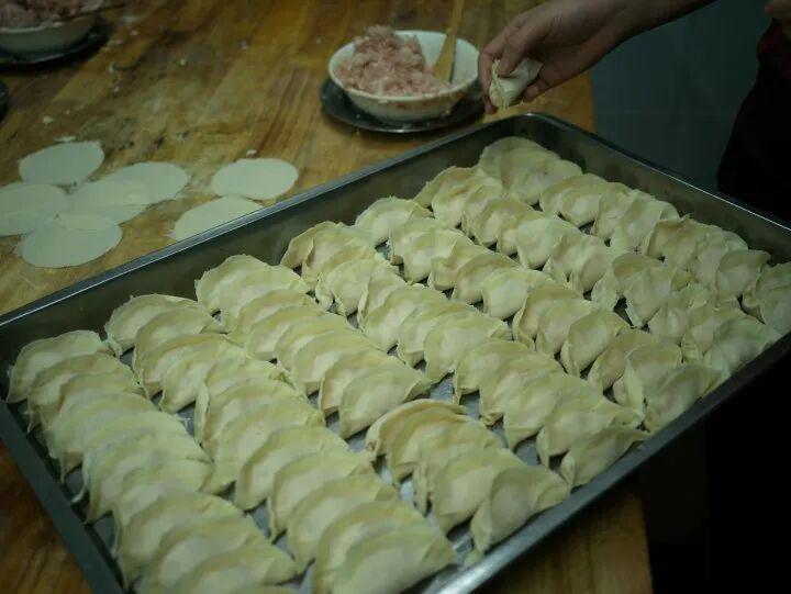 芳春告诉我,他们老家在仙居,做煎饺用的是纯肉馅,“不像你们杭州人,喜欢在馅里加菜啊什么的”。但同时,芳春也提到她老公早年在上海南翔小笼打工(此处划重点,后面要考的),在做煎饺的时候吸取了上海版汤包的优点,经过反复尝试,最后定下煎饺里自带汤汁的配方。