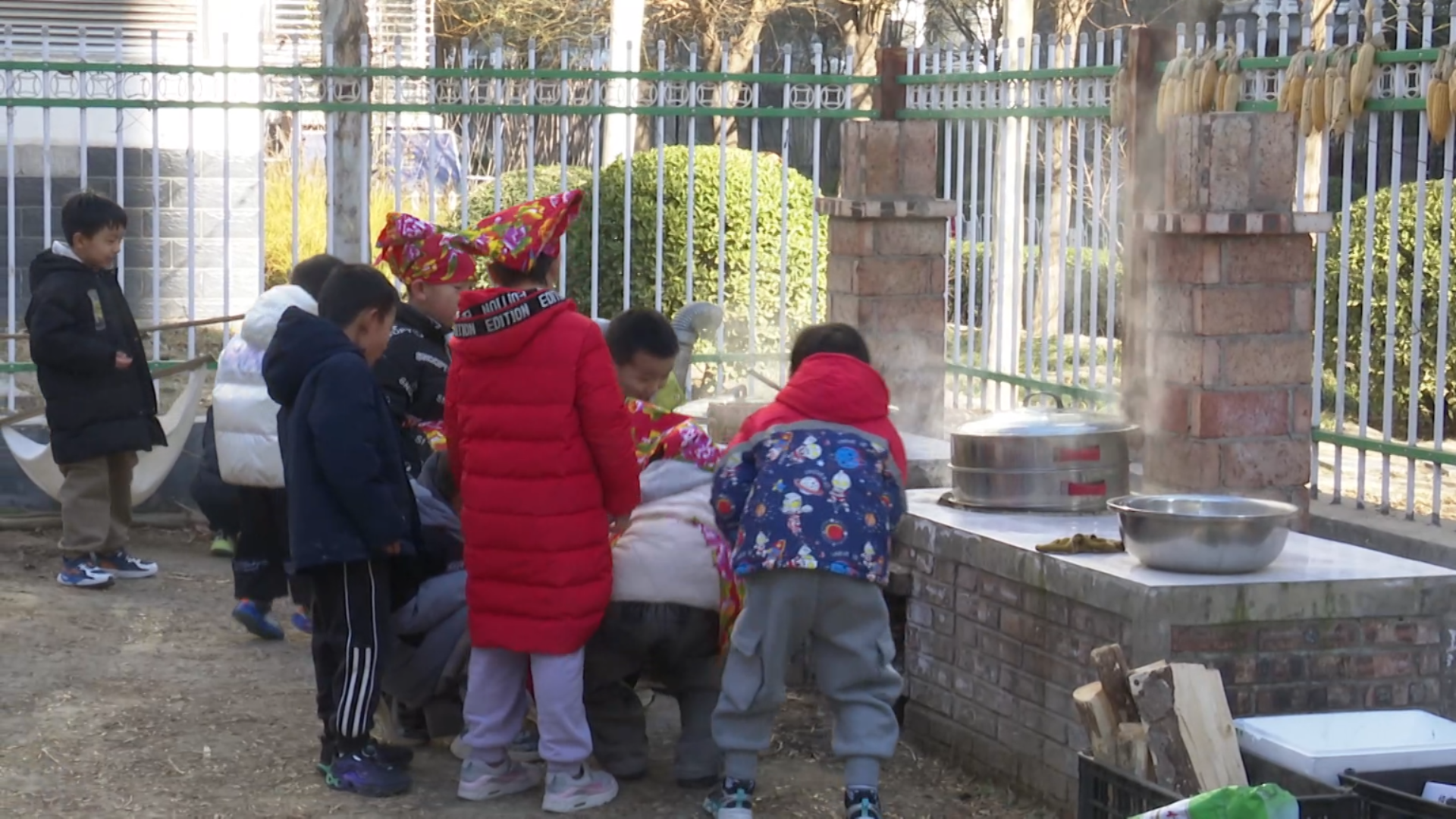 半个多小时后,准备工作全部就绪。孩子们来到幼儿园的小院,合力将花卷送入蒸锅,把包裹好锡纸的烤鸡、烤五花肉放进土窑,再将一串串关东煮食材投入吊炉中。另一边,有的小朋友则用茉莉花、白糖和牛奶精心调制着茉莉花奶茶。不一会儿功夫,小院子里便充满了浓浓的烟火气。