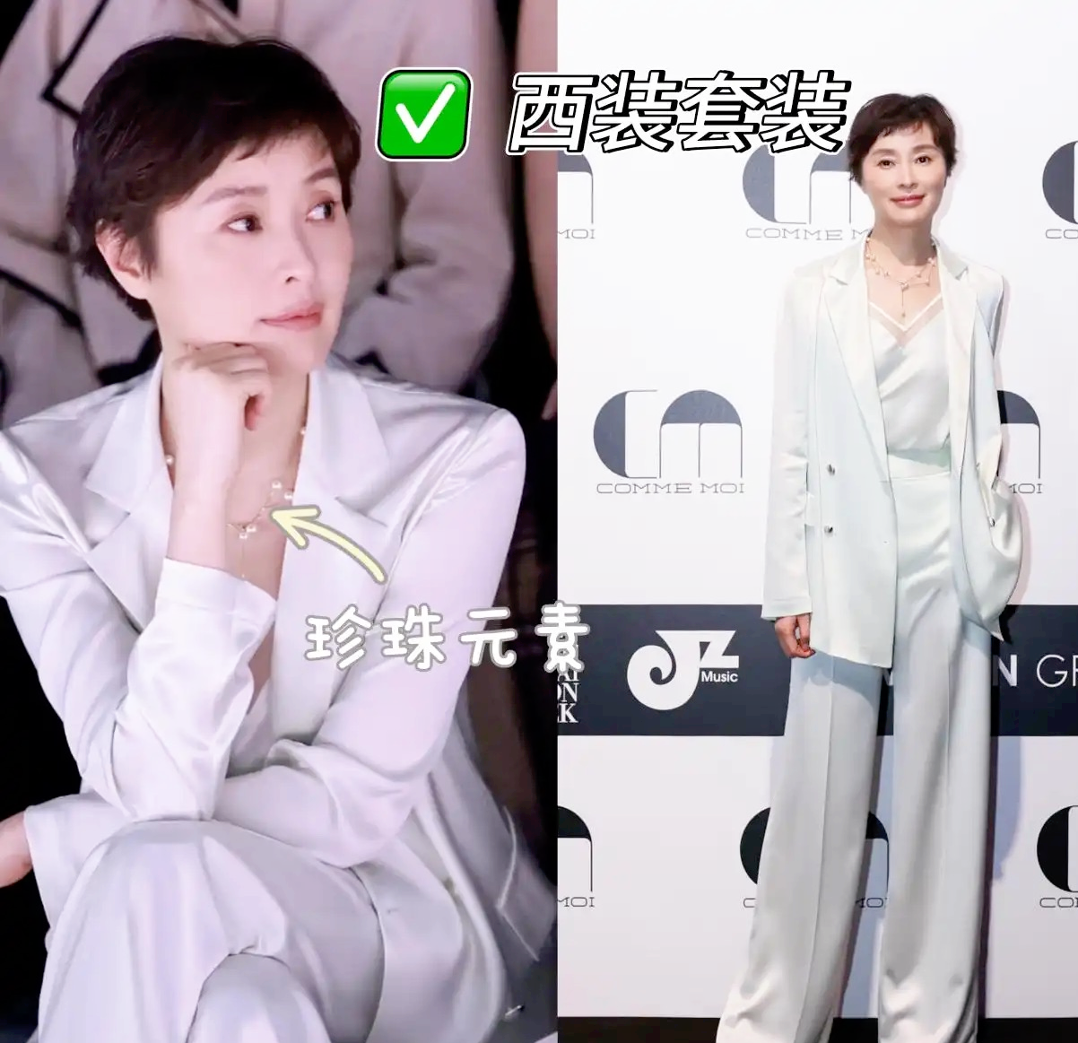 我们先看53岁的吴越从不穿得花枝招展。一袭简洁的白衬衫+牛仔裤,却比许多年轻女孩更有气场;她也常以简约干练的西装现身,那份从容自信远比强行装嫩更吸引人。