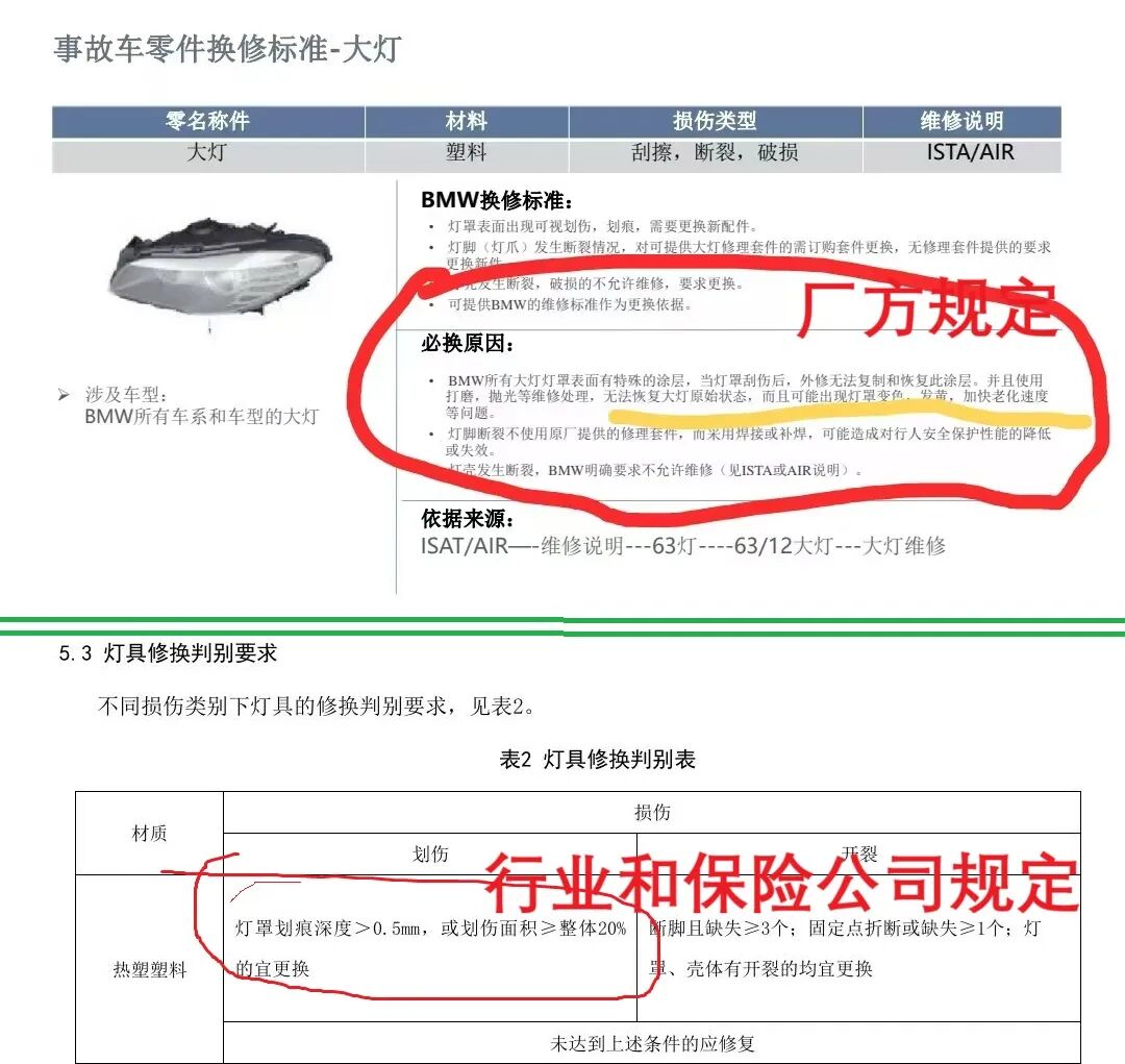 近期,我们经常听到一些朋友和行业内人的抱怨,就是保险公司定损越来越抠门了,甚至到了不讲道理的程度,更不用说法律了。同时,也接到了一些咨询,很多车主对此很困惑,但更多的是无奈,当然,也有一些网友思路还是比较清晰的,只是缺少一些专业的知识和法规支持。不管是什么情况,专业性和合法性是基础,另外,一些常识性的知识也很重要,可以给人直接得出判断结果。就像本案例中的,这位车主就从配件结构角度分析得出,这个配件不能修,这种思路值得广大车主借鉴,对此,编者总结为,需从技术角度去评估是而非外观判断是否可以修复,这种案例有很多,而且学理工科的人更容易理解,一点就通。 在物理领域,这里具体为材料领域,是不能单单看外表的,需要了解材料的内部构成和结构。就拿这个案例,一个大灯,表面刮花,保险公司肯定要求修复,不同意更换。它们的理由很简单、粗暴、直接,就是“修”好后看不出了。这就是所谓的外观上,确实是没有问题了,那么,他们不知道,或者不会给你讲,修复后大灯的表面涂层其实以及受损了,甚至完全没有了,这就是从技术角度去分析和评估了。这个问题,其实我们在历史文章中也有提到,可能有些人不信,那就看下附图,这是某品牌4s店维修说明,也就是技术标准的明文规定。你说,人家造车的,还不如它们保险公司专业吗?所谓专业的人干专业的事,这是不是有些班门弄斧了,事故车辆怎么修居然保险公司说了算??!! 上面的案例,只涉及大灯,还不算安全件的问题,如果修复处理,大不了灯面泛黄,龟裂等情况,但对一些钢圈,转向器等安全部件的修复,编者是完全不敢苟同的,这完全是拿车上人员的性命赚取保险公司的盈利。比如钢圈,已经失圆或开裂了,保险公司居然也不给换,他们的理念很简单,就是让他们的合作第三方修,只要看着完好就行。但是,物理学里的材料学科根本不是如此,像钢圈看着没有问题,但里面可能已经出现裂缝、金属疲劳等等严重影响安全的因素,技术根本不达标。或者,编者可以这样讲,市面上,至少95%以上修复配件的单位,根本没有检测这些修复配件的仪器设备,完全单单仅进行外观确认,有些甚至连外观都无法达标。 所以,在修换方面,还是尽量按厂方标准去处理,这样才能保证安全,维护自己的切实权益,体现大家交的保险费的真正最大价值。但是,目前的市场,由于内卷,一些4s店也在暗箱操作,有些是被保险公司逼的,有些纯粹为了利润。总之,各位车主需要有自己的判断,确保安全性,同时维护自身权益,只不过,遇到纠纷或争议时,需要专业性和法律依据。