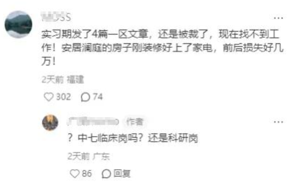 还有一位网友说“实习期发了4篇一区文章,还是被裁了,现在找不到工作。安居澜庭的房子刚装修好上了家电,前后损失好几万!”