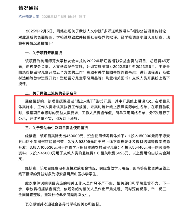 随着事件不断发酵,涉事高校很快意识到了事情的严重性,有记者发现杭州师范大学人文学院官网公示名单已删除,接着杭州师范大学发布情况通报,诚恳致歉,承认工作人员未统计实际线上授课学生名单,在项目验收时工作人员弄虚作假,简单采用网络名单,分7次进行了公示,导致名单不实,引发网上质疑。由此可以看出杭师大“多彩送教淳滋味公益项目受助名单照搬数十个百度人名”属实,存在严重的造假行为,好在被发现,不然真的就瞒天过海。