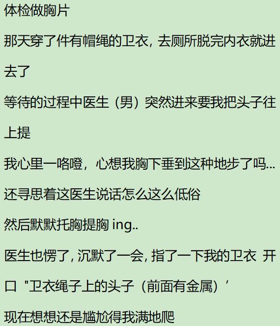 医生真的没什么男女观念,我有次去做心电图的时候,进门前敲过门,医生叫了请进,结果一进门看见一个大姐还裸着胸在那,我尴尬地退出房间,等那大姐出门了才重新进去。真的好尬