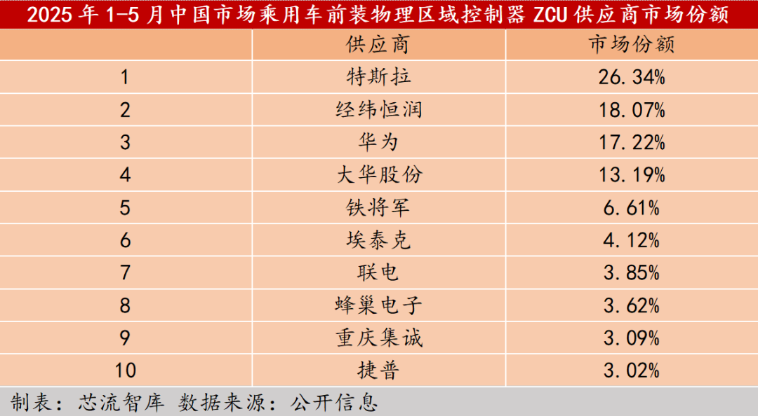 数据显示,在2025年1-5月中国市场乘用车前装物理区域控制器ZCU市场中,经纬恒润以18.07%的市场份额仅次于特斯拉,位于国产厂商TOP1。
