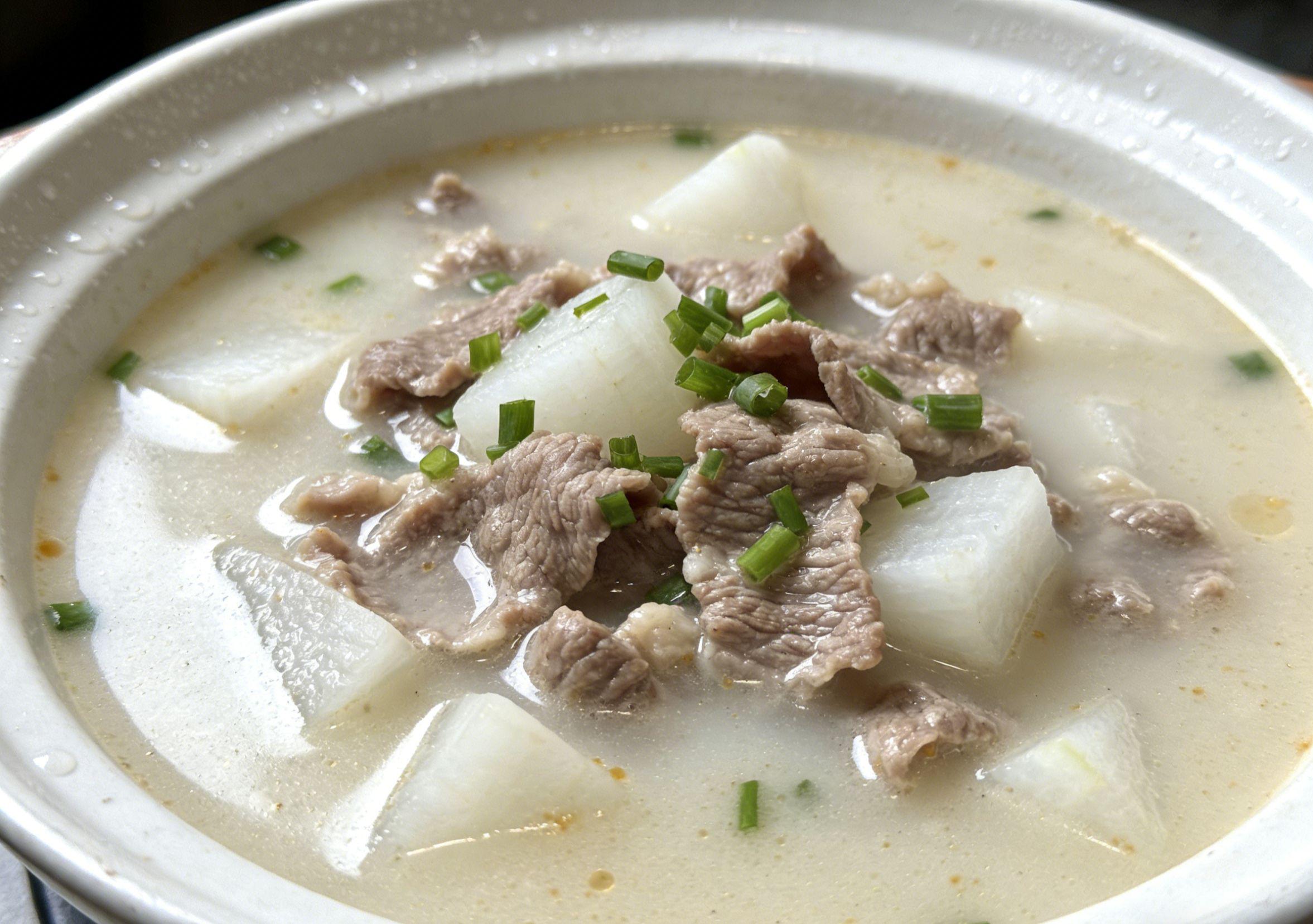 牛腩同样需要焯水,冷水下锅加姜片和料酒,煮沸后撇去血沫,捞出用温水冲洗干净。锅中放少许油,油热后放入姜片、八角和桂皮爆香,倒入牛腩块翻炒至表面微黄,加入适量清水,水量要没过牛腩。大火煮沸后转小火慢炖 1 小时,待牛腩炖至八分熟时,加入白萝卜块,继续炖 20 分钟,直到白萝卜变得软糯透明。最后加适量盐调味,无需添加过多香料,以免掩盖食材本身的鲜香。
