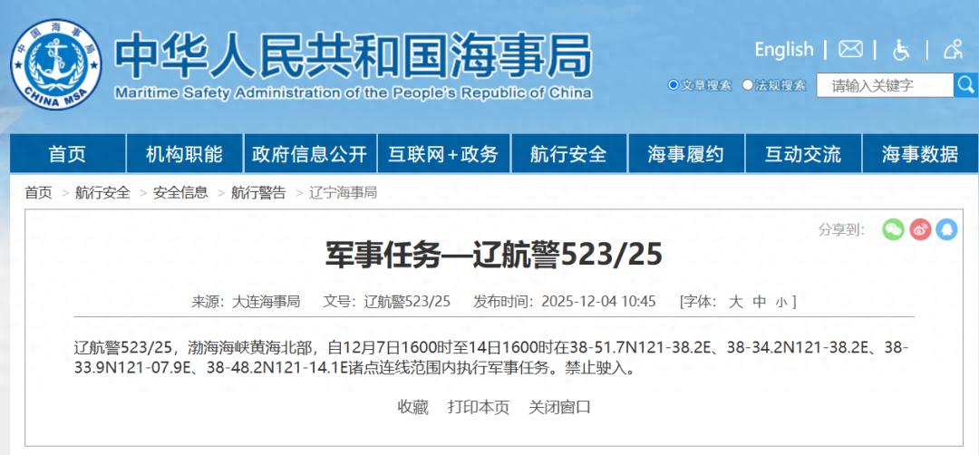 航行警告,禁止驶入! 黄河新闻网吕梁频道 2025-12-07 09:41 ·山西 ·黄河新闻网吕梁频道官方网易号 据中国海事局网站消息,大连海事局发布航行警告,12月7日16时至14日16时,渤海海峡黄海北部部分海域执行军事任务,禁止驶入。 打开网易新闻 查看精彩图片 来源:中国海事局网站