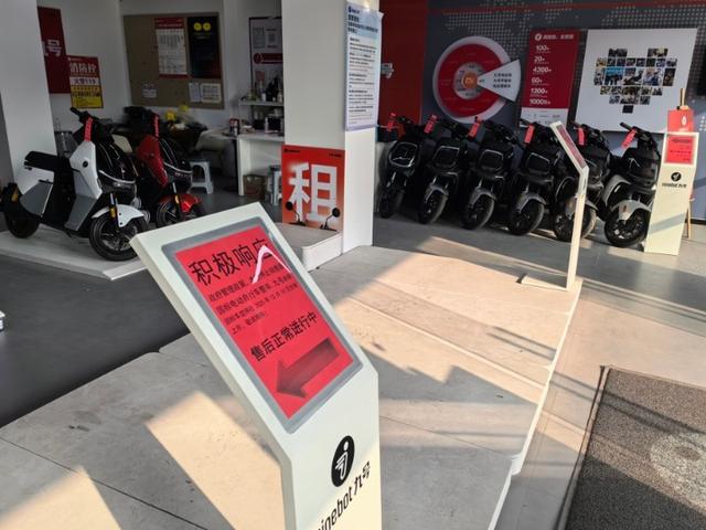 龙吴路上的九号车行,店内最中间一排空间空着,贴有“新车型将在12月10日全新上市”的贴纸,而其余区域,则摆放着10多辆“九号DZ110P”电动自行车。