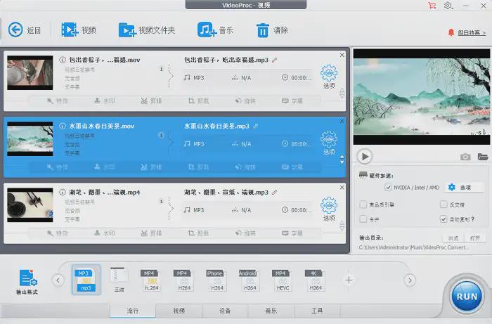 操作教程:启动软件后,选中【视频】标签页,上传目标视频文件,在【输出格式】中选定【MP3】等音频格式,点击【RUN】按钮即可开始。