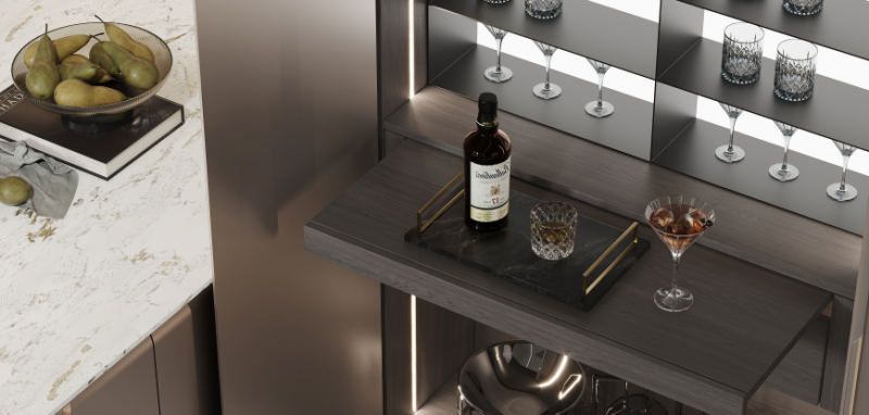 条纹玻璃柜门不仅赋予空间通透视野,清晰的线条也强化了秩序之美,为整体氛围注入现代轻奢气质。上翻式玻璃门结合斜装展示酒架,让每支红酒如艺术品般被珍藏,标签与年份一目了然,存取皆从容优雅。