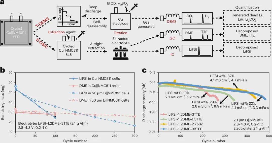 本文优化了一种滴定质谱法,用于量化残余固态电解质界面(SEI,指锂金属负极体积变化后残留的SEI)中锂的积累,以及电子隔离的“失活”锂(死锂)的含量,从而监测LMB中活性锂的含量。进一步地,本文开发了一种提取气体-离子色谱法(如图1a所示),用于量化局部高浓度电解液(LHCE)中每种组分的消耗。LHCE由双(氟磺酰)亚胺锂(LiFSI)盐、二甲氧基乙烷(DME)溶剂和1,1,2,2-四氟乙基-2,2,3,3-四氟丙基醚(TTE)稀释剂以1:1.2:3摩尔比组成。通过这些技术,本文定量绘制了实际LMB在循环过程中活性锂和电解液各组分的演变图,以及它们的界面反应路径。结果表明,LiFSI的分解在界面反应中占主导地位(见图1b)。