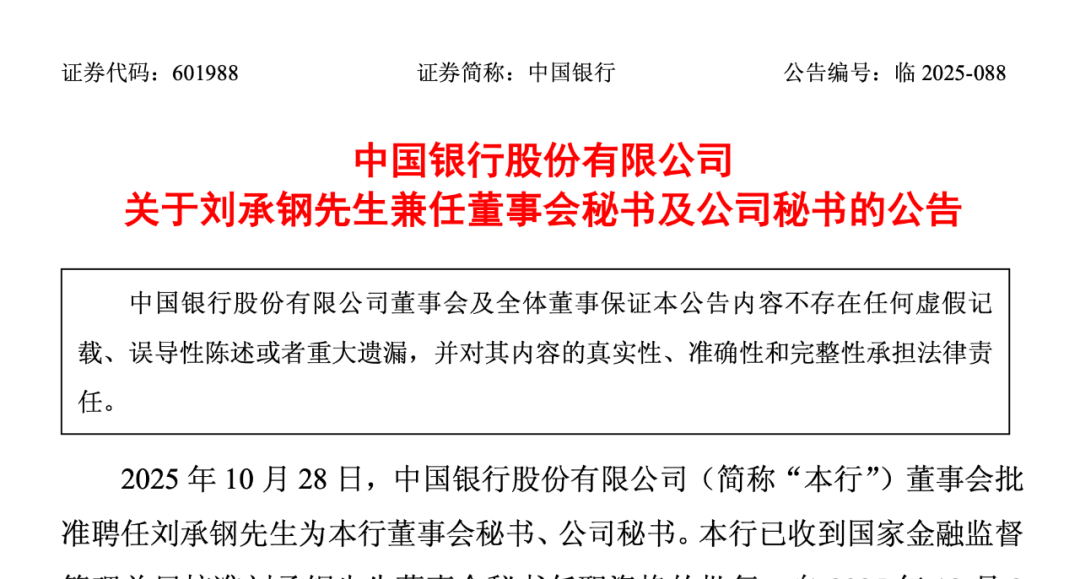 在董事会秘书及公司秘书任职方面,2025年10月28日,中国银行董事会批准聘任刘承钢先生为本行董事会秘书、公司秘书,并已收到国家金融监督管理总局核准刘承钢先生董事会秘书任职资格的批复。