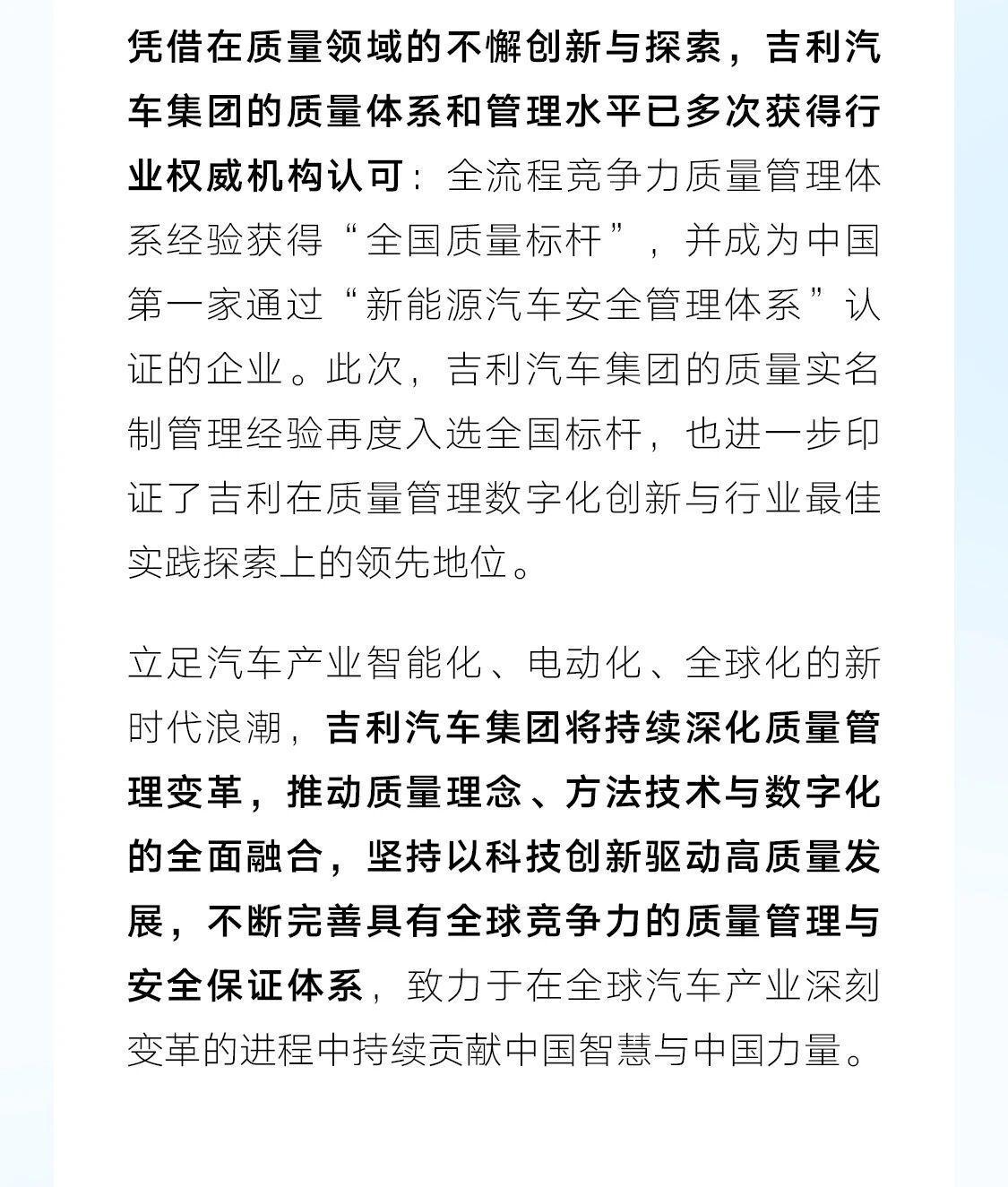 近日,中国质量协会正式发布了2025年“质量标杆典型经验”名单,吉利汽车集团凭借《基于数字化转型驱动下的质量实名制管理经验》成功入选,成为本年度质量管理数字化领域的标杆性实践代表。