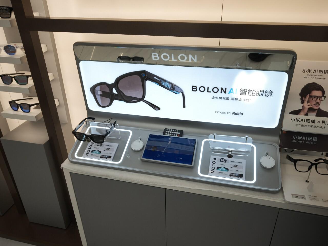 相比之下,正佳广场的「AI 眼镜味」就浓了很多,这里的宝岛眼镜就展示了小米 AI 眼镜,以及 Rokid 与 BOLON 共同打造的 BOLON AI 智能眼镜。隔壁还有一家 BOLON 品牌店,也不意外地展示了最新的 BOLON AI 智能眼镜。