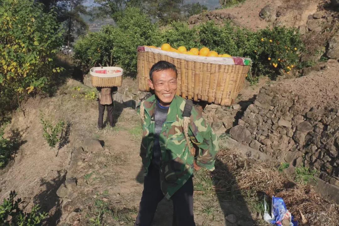 ▲秭归老乡背着满满一筐九月红橙下山