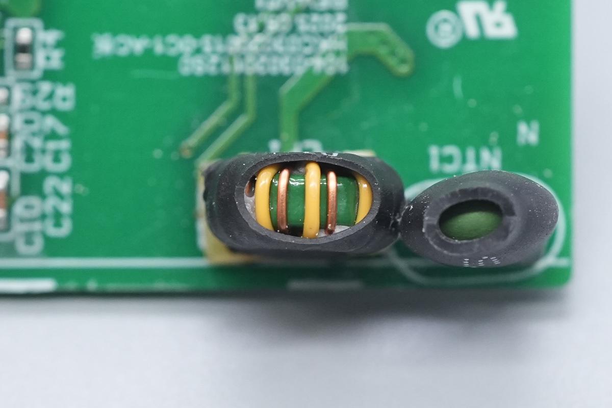 NTC热敏电阻和共模电感均外套热缩管绝缘保护,共模电感底部设有电木板并打漆加固。
