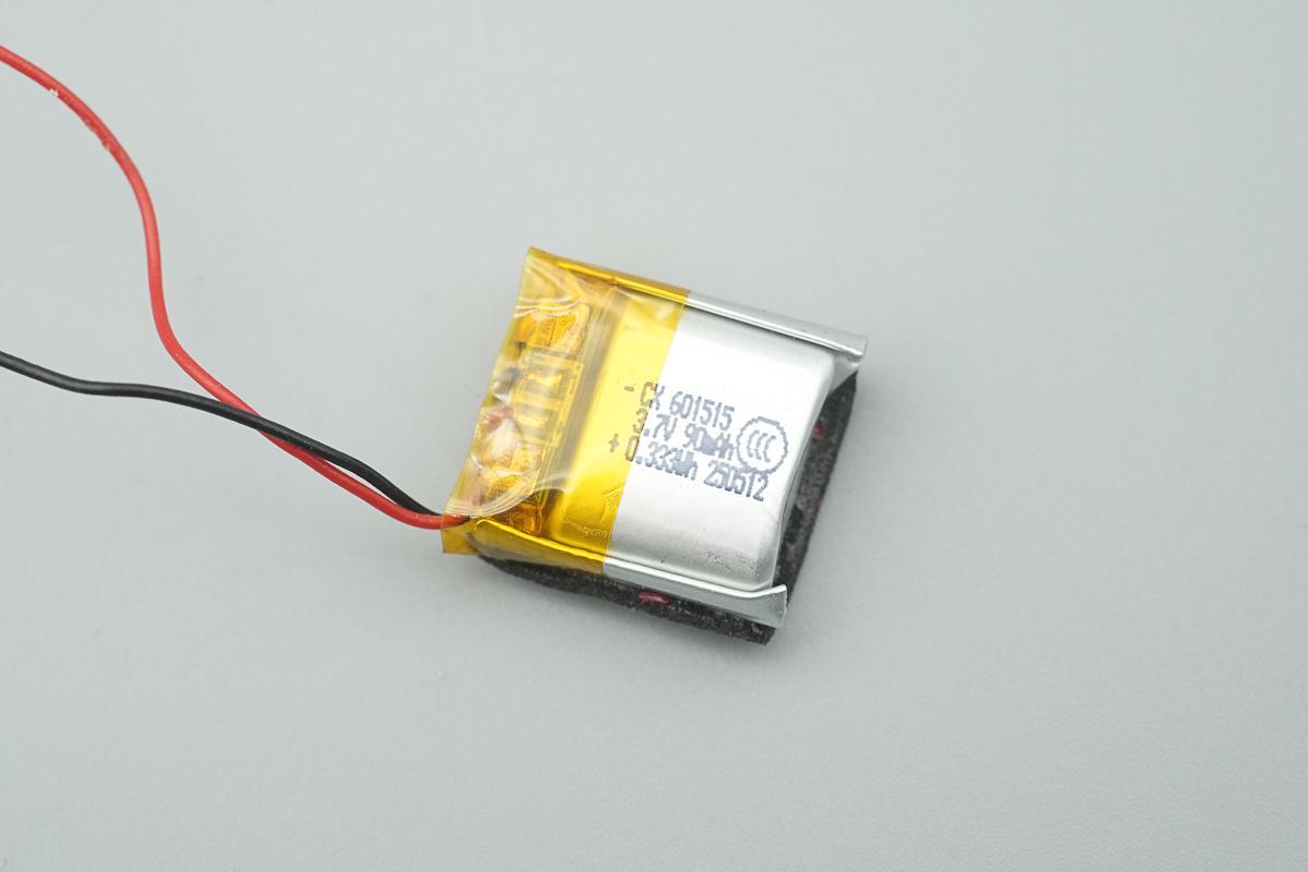 电池为601515尺寸,额定电压3.7V,容量90mAh,能量0.333Wh,通过了CCC认证。