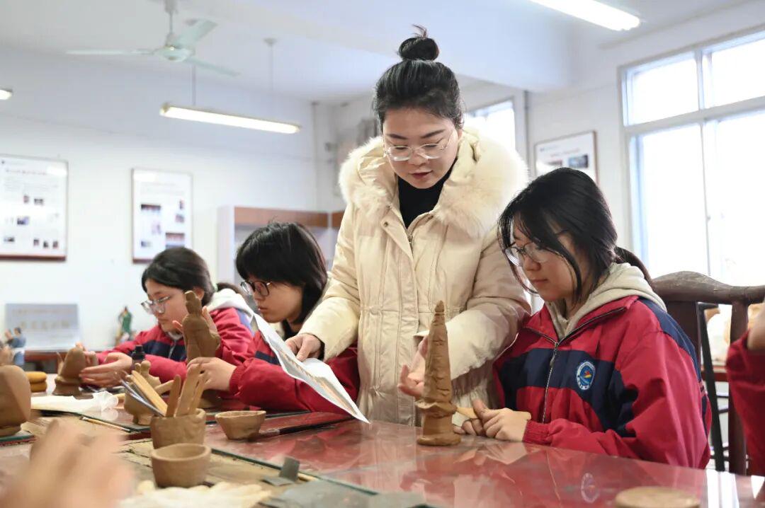 在民族传统技艺工作室中,学生围坐在工作台前,手中揉捏着湿润的陶泥,梁氏泥塑第六代传承人梁艺丹一边示范拉坯、塑形等技法,一边讲解泥塑的历史渊源与文化内涵。学生从基础的揉泥、搓条开始,逐步尝试制作简单器皿,再进阶到人物、动物等复杂造型。这种“手把手”的教学方式,让学生直观理解泥塑的工艺精髓,而非仅停留在理论层面。