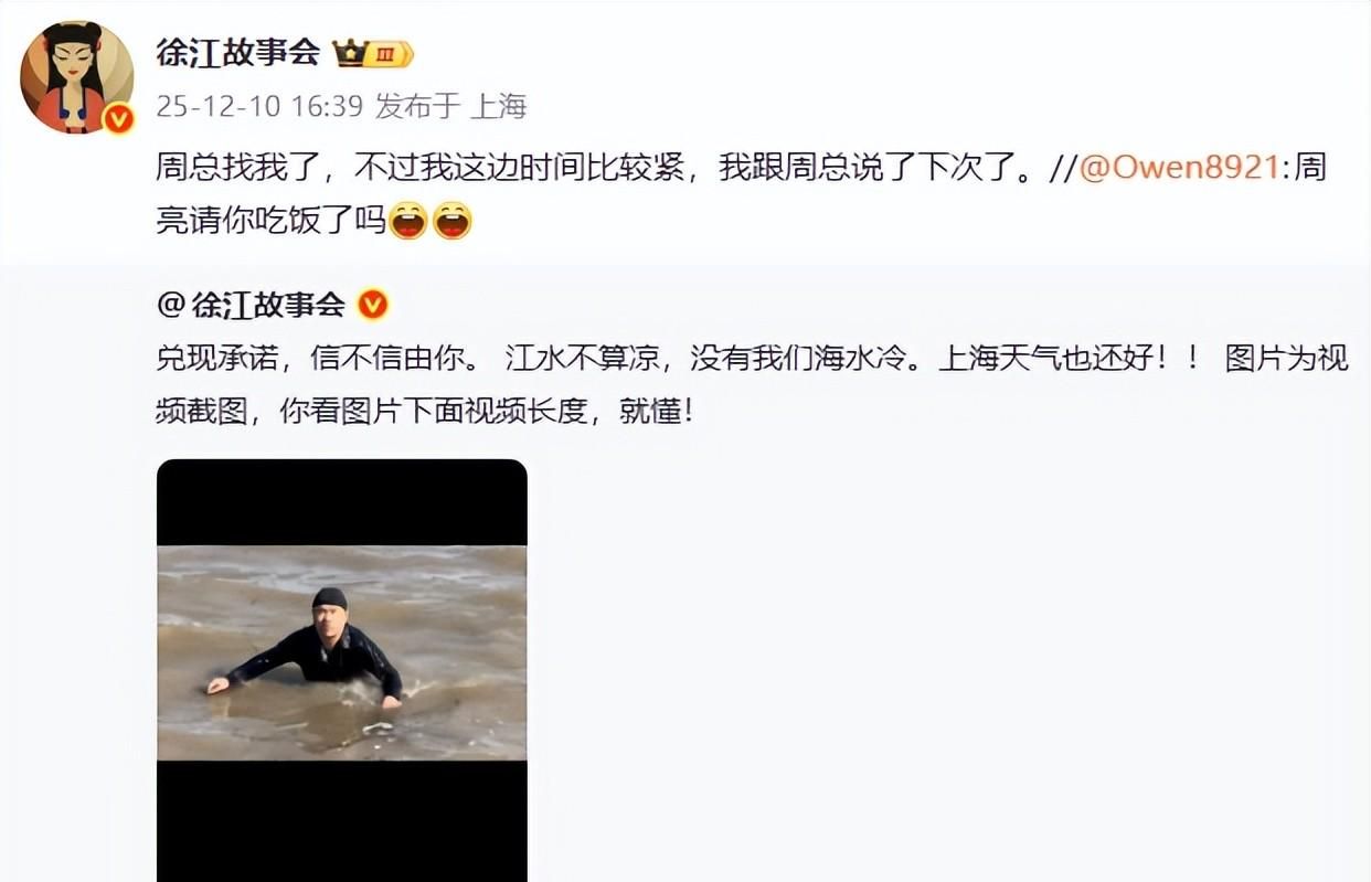 对此,徐江老师表示,“兑现承诺,信不信由你。 江水不算凉,没有我们海水冷。上海天气也还好!图片为视频截图,你看图片下面视频长度,就懂!”对于徐江老师这样的行为,球迷们也给与了称赞,“是个老爷们!”