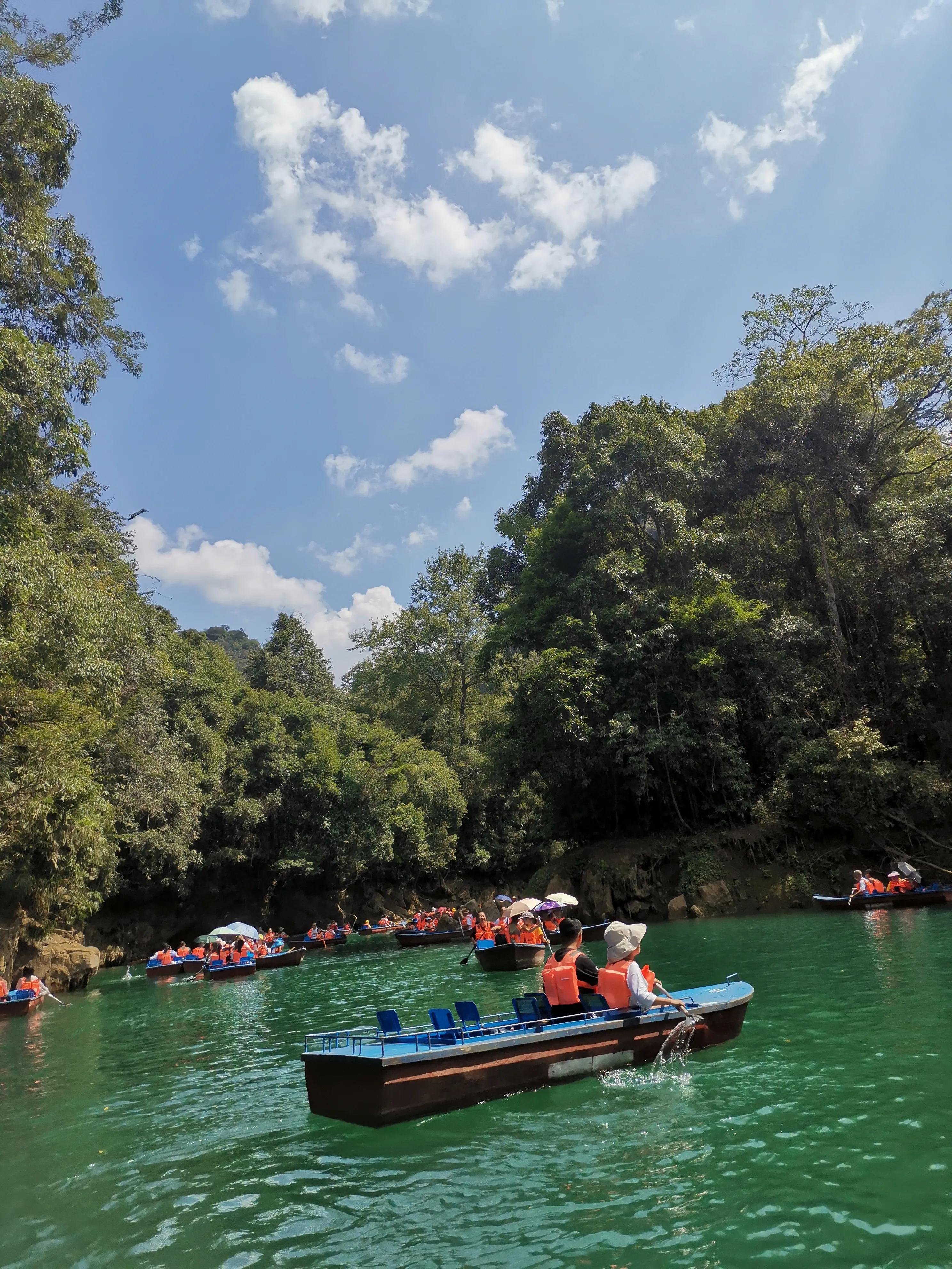 第三天的荔波小七孔简直是“人间绿宝石”!碧绿的河水清澈见底,我们沿着68级跌水瀑布一路往上走,空气里都是负氧离子的味道。最精彩的是蒙旅安排的鸳鸯湖包船体验,这可是普通自由行游客很难预约到的项目。