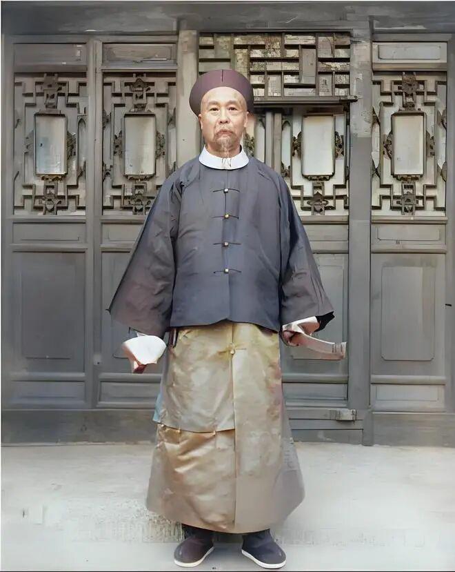 他身上的长袍马褂剪裁得体,布料虽在岁月的侵蚀下显得有些黯淡,却难掩其制作精良的质感,胸前的盘扣整齐排列,彰显着传统服饰的独特韵味。下身的白色裳裙,搭配着一双黑面白底的布鞋,尽显清末官员的着装风范。
