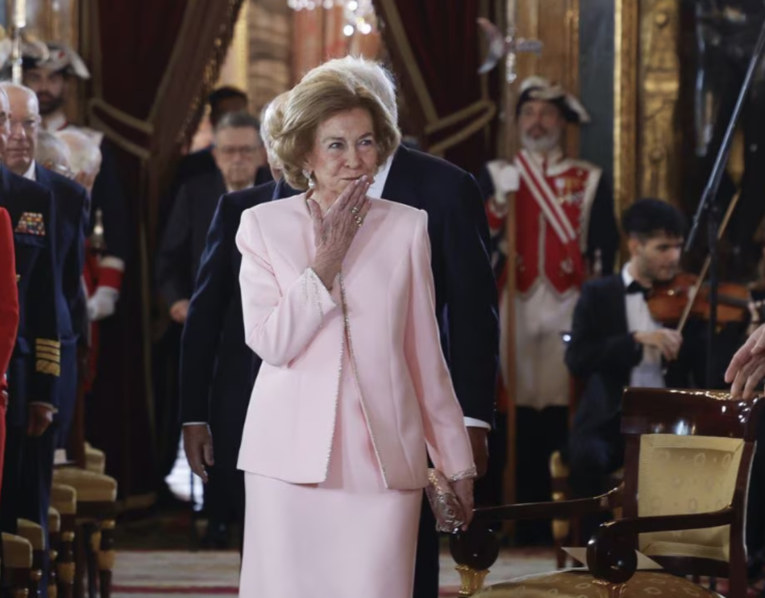 脚下的银色平底鞋是点睛之笔,放弃了高跟鞋的束缚,既适配王室礼仪的舒适需求,又与粉色造型形成柔和对比,银色的光泽感为整体增添了精致细节。发型上的短卷发蓬松有型,修饰脸型的同时尽显干练,搭配精致耳环,没有多余的繁复装饰,却在细节处彰显王室格调。从年轻美到耄耋之年,索菲亚王后的穿搭始终坚守 “端庄为底、柔和为韵”,粉色系的选择更是打破了年龄界限,印证了 “优雅与岁月无关” 的真理。