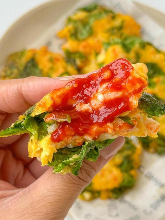 4. 焖熟与出锅:煎约2分钟,待底部完全定型、边缘微微翘起时,沿着锅边淋入约2汤匙清水,立刻盖上锅盖。“水煎法” 利用蒸汽将上层的虾仁和蛋液焖熟,同时保持生菜的翠绿和脆嫩。焖约1-2分钟,开盖看到表面凝固,即可用一个大盘子辅助翻面,或将饼滑出对折,再煎30秒即可出锅切块。虾仁全熟,饼体柔软多汁。