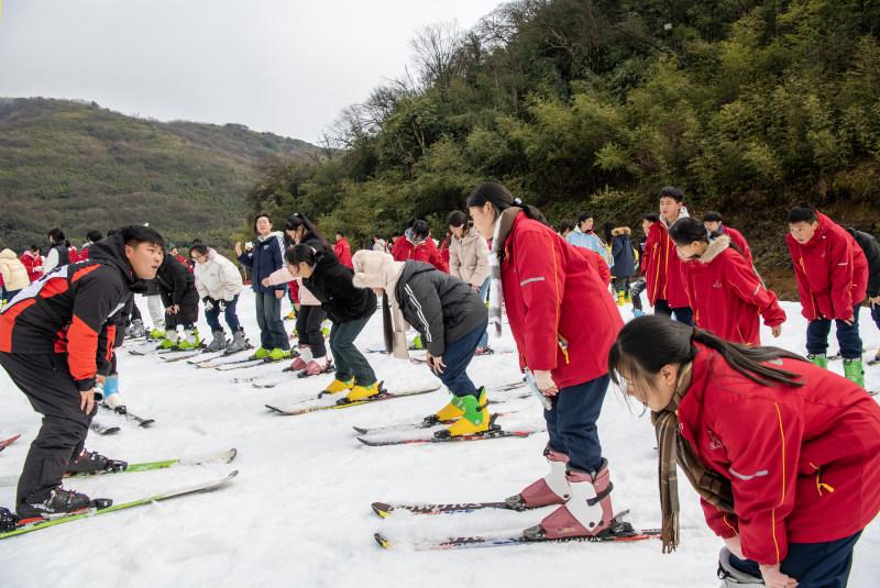12月10日,重庆南川金佛山滑雪场,400余名中学生在教练指导下学习滑雪。