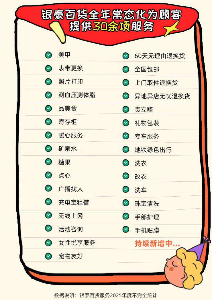2025年,银泰百货共计为超过13000位顾客免费包装了礼物,用掉近7000张包装纸;为552300位姑娘免费做了美甲或手部护理;帮助更换了137500条表带;送出了7750000枚叶黄素鸡蛋……