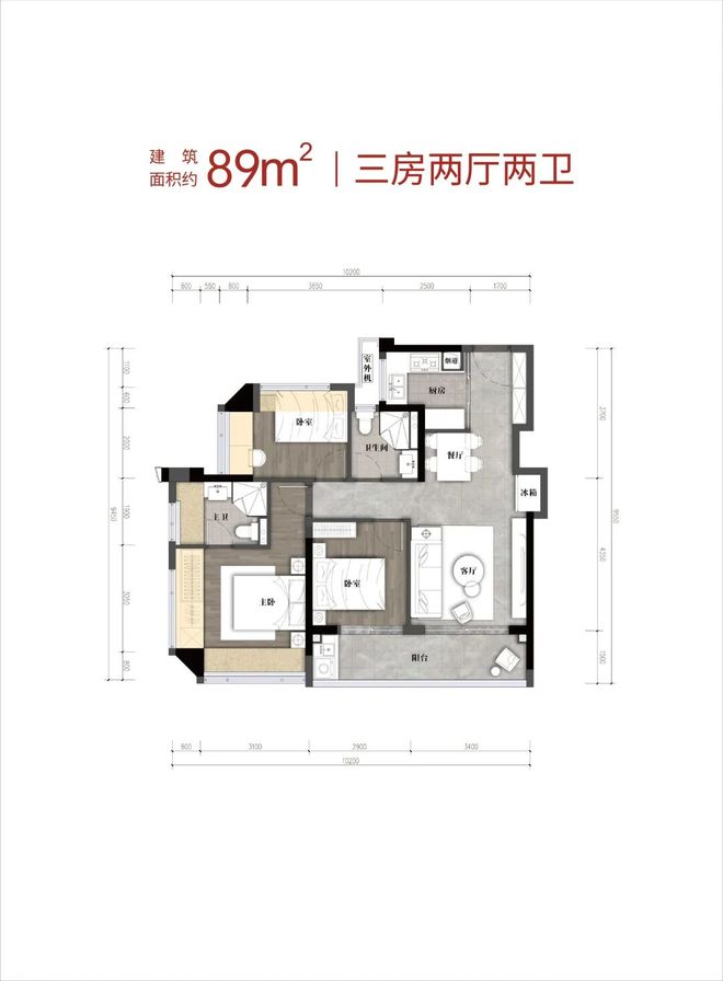 89㎡的3房2厅2卫,设计的是竖厅格局,客厅3.4米开间,LDKB一体化,S墙设计预留冰箱卡槽位,3个卧室分别做到了3.9米/2.9米/2.6米的宽度,客厅连接次卧出6.3米长的大阳台,L型厨房,卫生间干湿分离,有西北、西南或东南朝向。