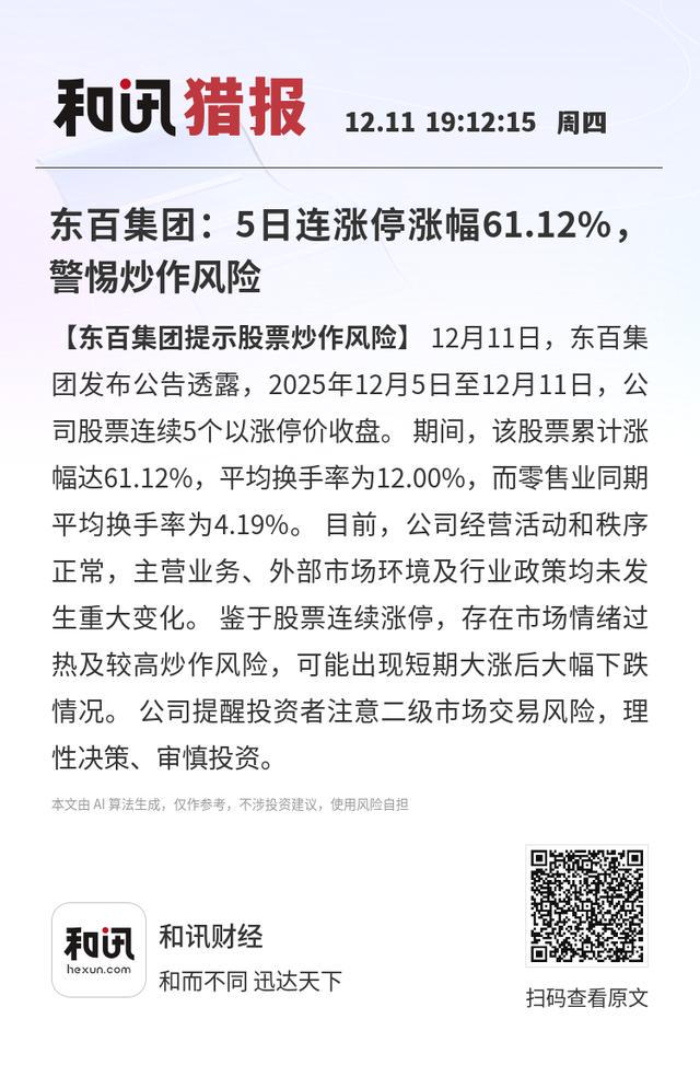 【东百集团提示股票炒作风险】12月11日,东百集团发布公告透露,2025年12月5日至12月11日,公司股票连续5个以涨停价收盘。期间,该股票累计涨幅达61.12%,平均换手率为12.00%,而零售业同期平均换手率为4.19%。目前,公司经营活动和秩序正常,主营业务、外部市场环境及行业政策均未发生重大变化。鉴于股票连续涨停,存在市场情绪过热及较高炒作风险,可能出现短期大涨后大幅下跌情况。公司提醒投资者注意二级市场交易风险,理性决策、审慎投资。