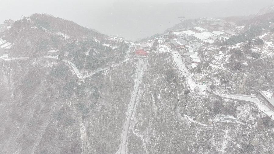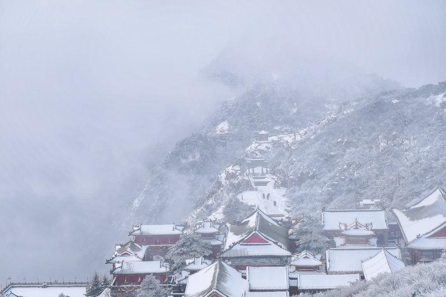 泰山降雪,让世界按下了慢放键。平日里喧闹的山谷归于寂静,只有雪花簌簌落下的声音,是天地间唯一的梵音。远处的山峦渐渐模糊了轮廓,与灰蒙蒙的天空融为一体,只剩下近处的殿宇、古木和奇石,被雪勾勒出愈发清晰的剪影。