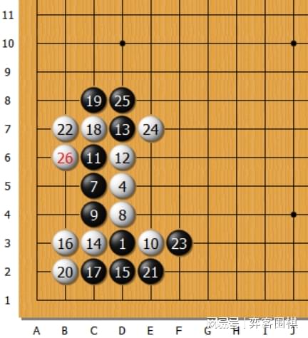 此时,左下角出现了著名的“大雪崩”型,记录也有了第一条——左下的“雪崩型”,黑23走错了,应在A位挡取角。如谱弈至26,白不但在内线取得实利,也破了黑在外线的外势。