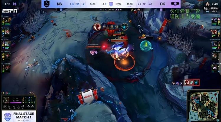 首轮的第一场BO3是NS对阵DK,这场比赛只能说mid gap,NS在首局拿到优势的情况下差点被翻盘,但在后续的2、3局中,showmaker则是站了出来,第二局单杀scout,并且靠着下路积累的优势,仅仅27分钟就扳平比赛,决胜局showmaker的阿狸更是游刃有余,各种游龙,再配合lucid的盲僧,直接打出了31-4的夸张人头比,DK顺利晋级胜者组。