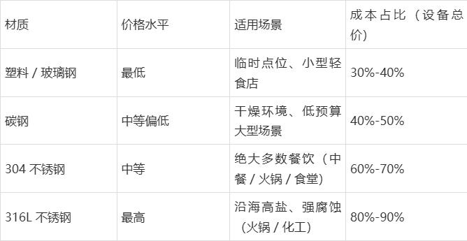 1.材质取舍:普通餐饮优先 304 不锈钢(性价比最高),避免 201 不锈钢(寿命短 50%)