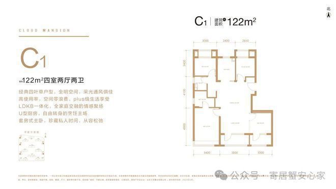 122m²四居室:经典四叶草户型,全明空间,采光通风俱佳。高使用率,空间零浪费,plus级生活享受。LDKB一体化,全家庭交融的情感聚场。U型厨房,自由转身的烹饪主场。套房式主卧,珍藏私人时间,从容松弛。