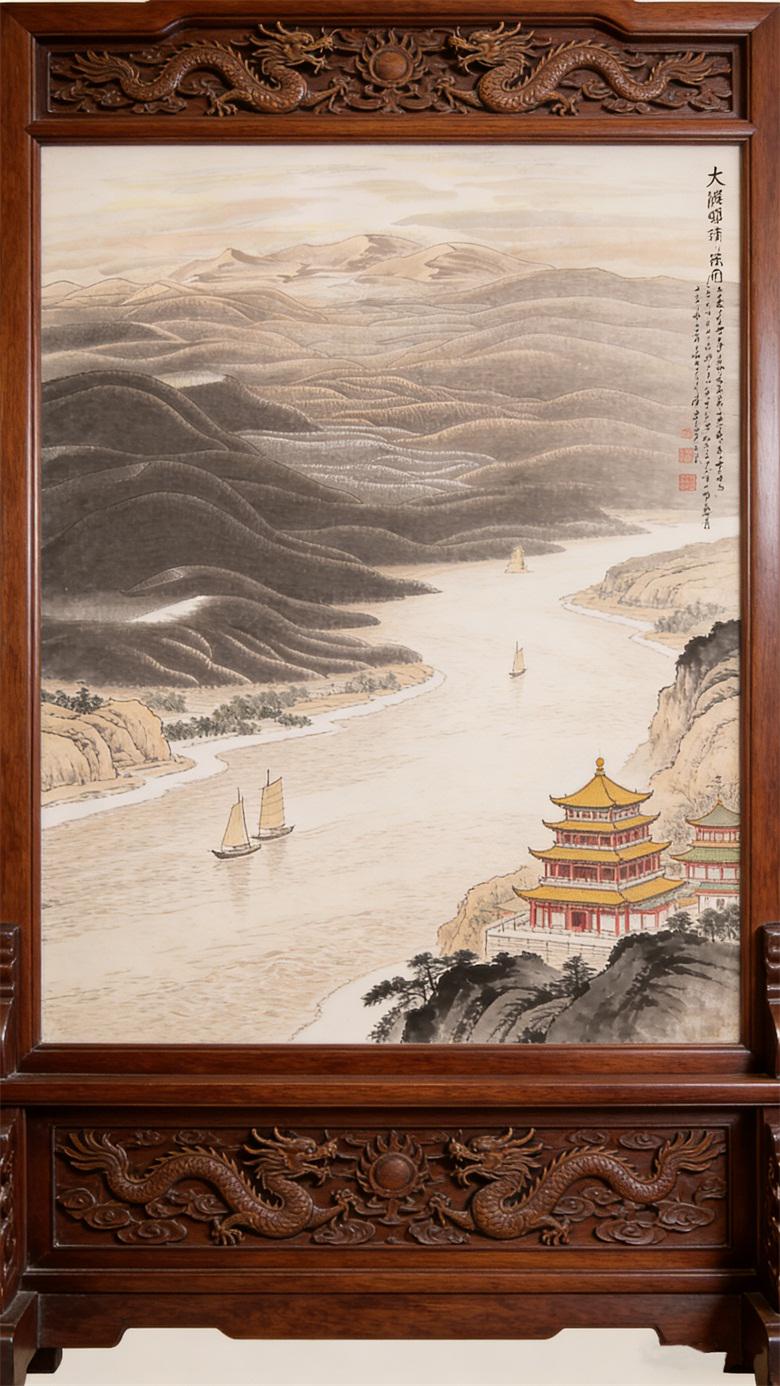 • 形制:选竖版插屏(落地大屏),高约2.8米,屏面竖向复刻画作的山河楼阁,顶部做歇山顶式木雕帽檐。