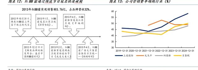 营销升级:综艺冠名+明星代言,放大品牌声量。创始人吕义雄曾表示“打广告,不一定能做成品牌,不打广告,很难做成品牌”,彰显了公司对于营销的重视和魄力,从公司与其他化妆品龙头的对比来看,营销费用率显著领跑。2013年后品牌开启“高举高打”营销,冠名《非诚勿扰》《快乐大本营》《蒙面歌王》等现象级综艺。同时2012年开始签约林志玲、郭采洁、鹿晗等流量明星,打造红BB 霜、墨菊巨补水等大单品。营销高投入也带动公司大单品放量和品牌力提升,2013年红BB霜实现销售额5.76亿,占品牌营收32%,可见韩束在打造爆品方面有可复制的经验。