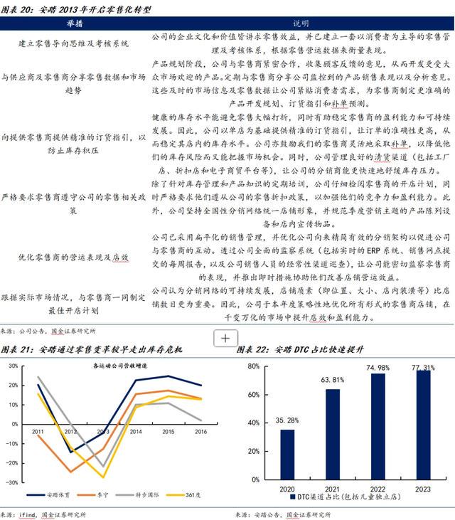 2013年,安踏在行业内首先开启零售导向策略,以提升对公司零售商的控制,以及促进零售商的竞争力、对急速变化的市场的反应速度和提升店效。具体举措包括1)建立零售导向思维及考核系统。2)与供应商及零售商分享零售数据和市场趋势。3)向提供零售商提供精准的订货指引,以防止库存积压。4)严格要求零售商遵守公司的零售相关政策。5)优化零售商的营运表现及店效。6)跟据实际市场情况,与零售商一同制定最佳开店计划。在零售改革的带动下,安踏率先走出库存危机,2013-2016年增速领跑全行业。