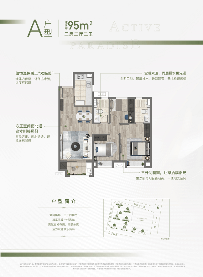项目主推建面约86 - 95平方米的两至三房户型,满足不同家庭结构的需求。86平方米的两房户型,全明设计,南北通透,尺度开阔;95平方米的三房户型,南北通透,三开间朝南,户型方正,餐客厅一体化设计,主卧套房设计,带独立卫生间,保障私密性和主人尊荣感。项目得房率高达80% - 84%,空间利用率极高。